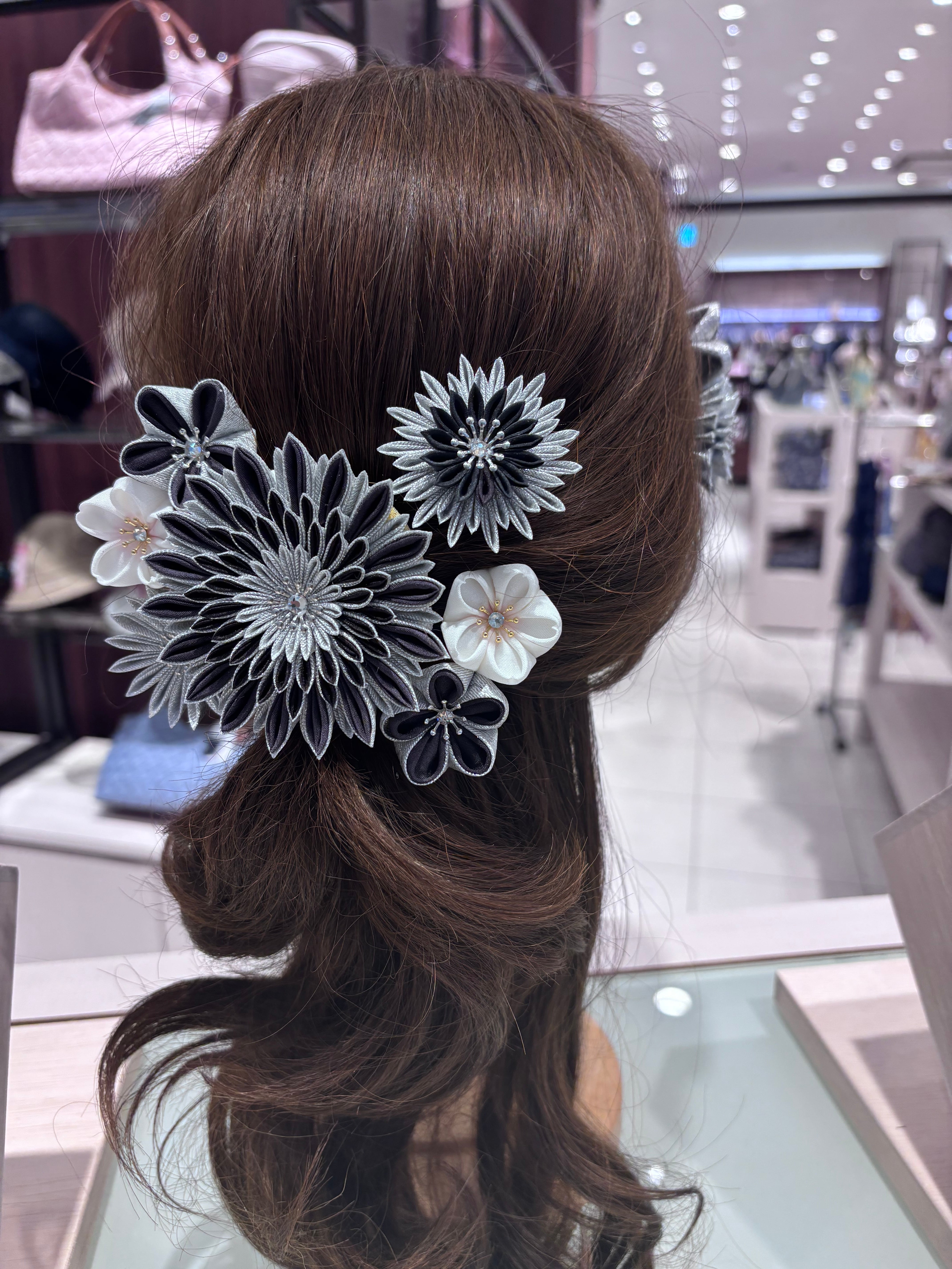 正絹手染め つまみ細工の髪飾り 黒✖︎シルバー