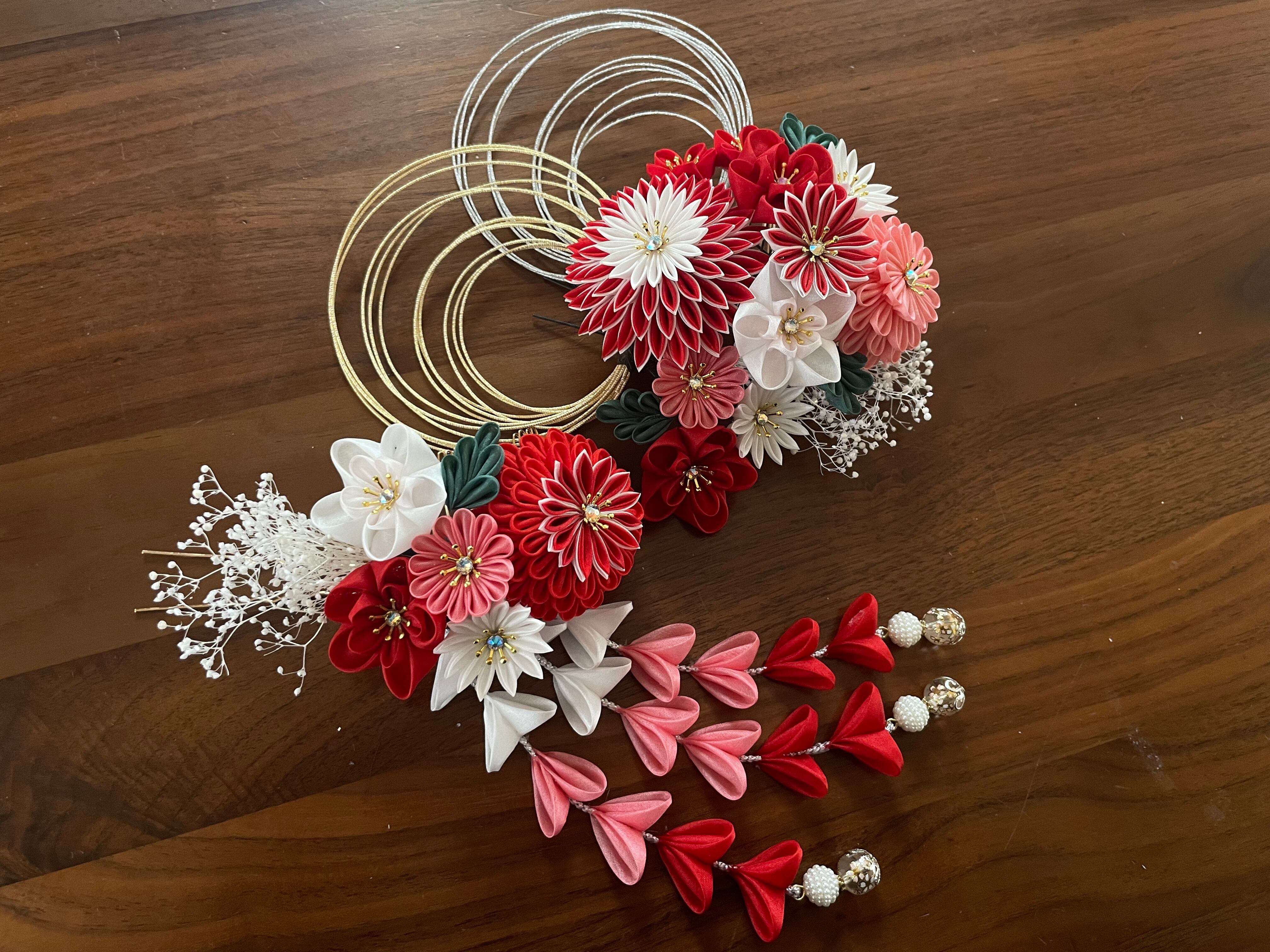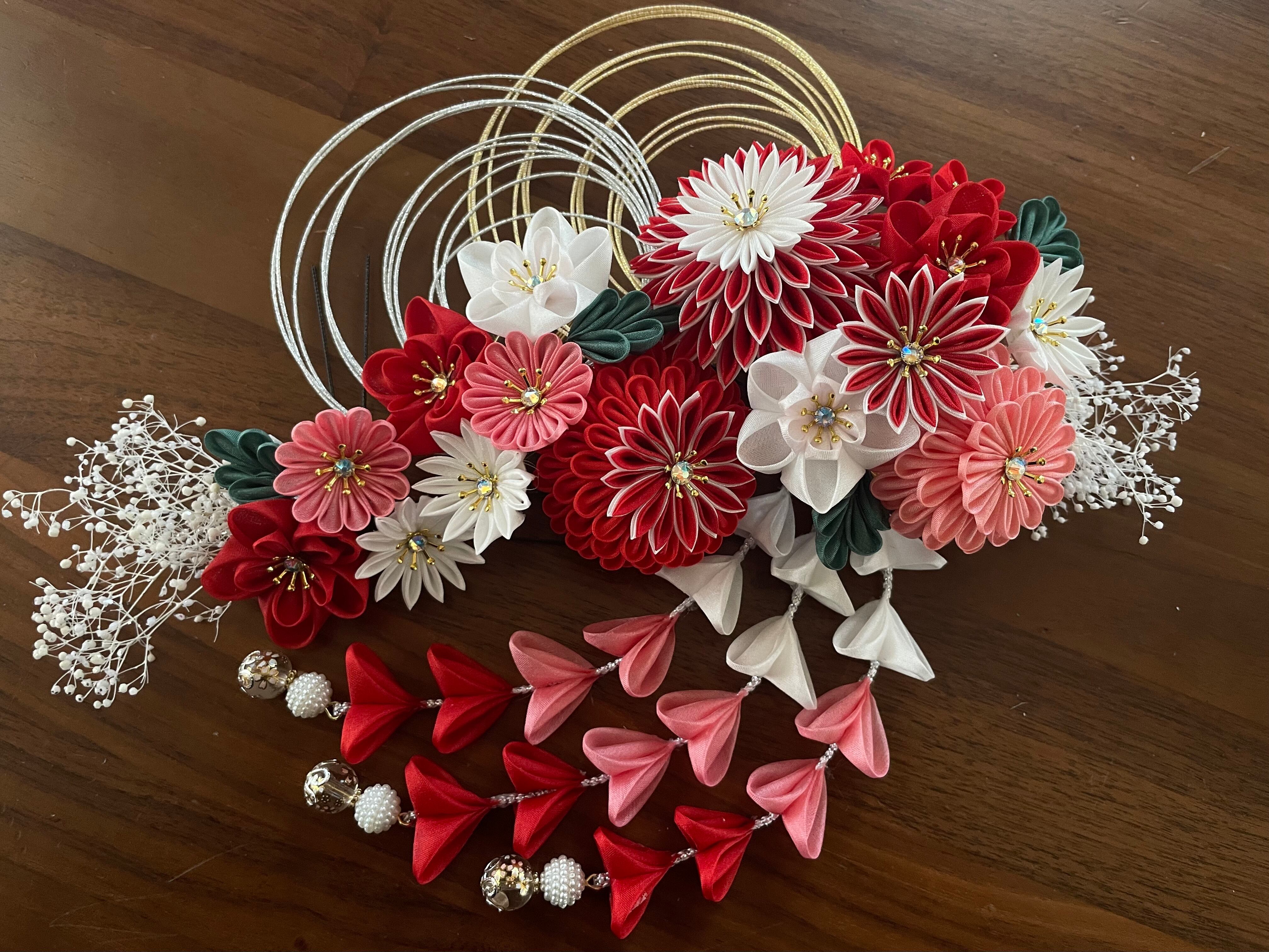 この髪飾りには、日本の伝統的なつまみ細工の技法が使われています。繊細で精密な作り手仕事により、花や葉っぱのような形状が生み出されており、細部まで美しい仕上がりとなっています。</br>