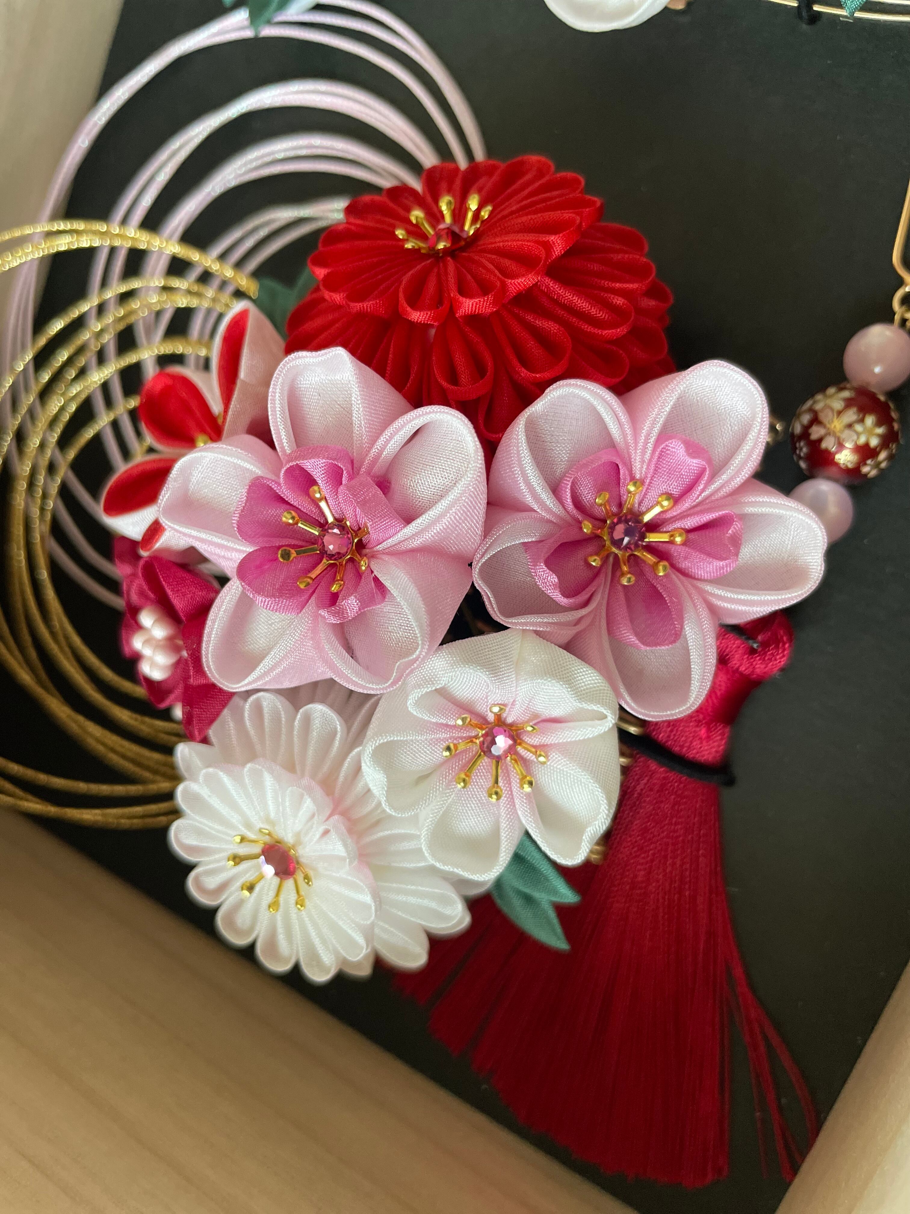 この髪飾りには、日本の伝統的なつまみ細工の技法が使われています。繊細で精密な作り手仕事により、花や葉っぱのような形状が生み出されており、細部まで美しい仕上がりとなっています。</br>
