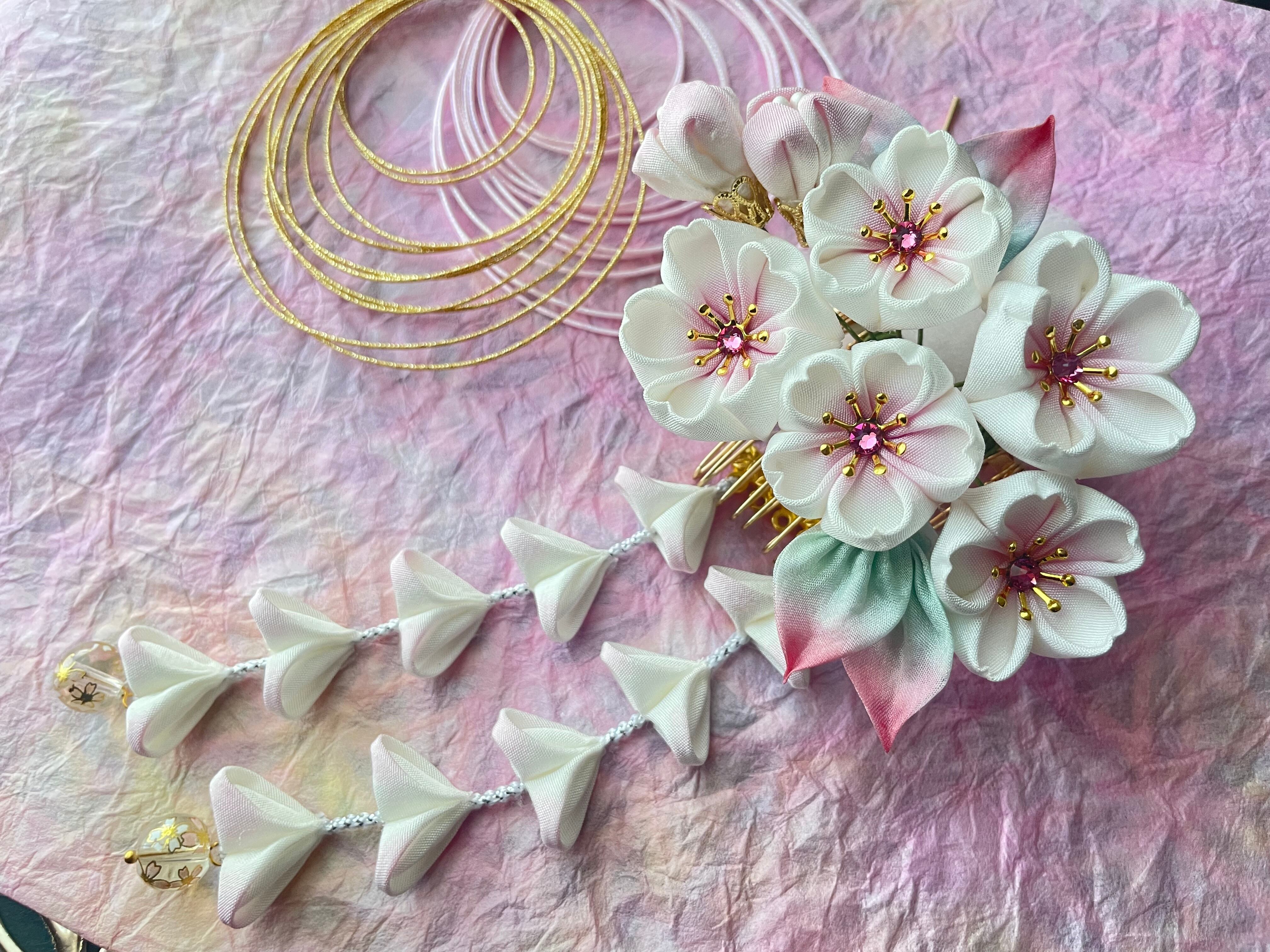 この髪飾りには、日本の伝統的なつまみ細工の技法が使われています。繊細で精密な作り手仕事により、花や葉っぱのような形状が生み出されており、細部まで美しい仕上がりとなっています。</br>