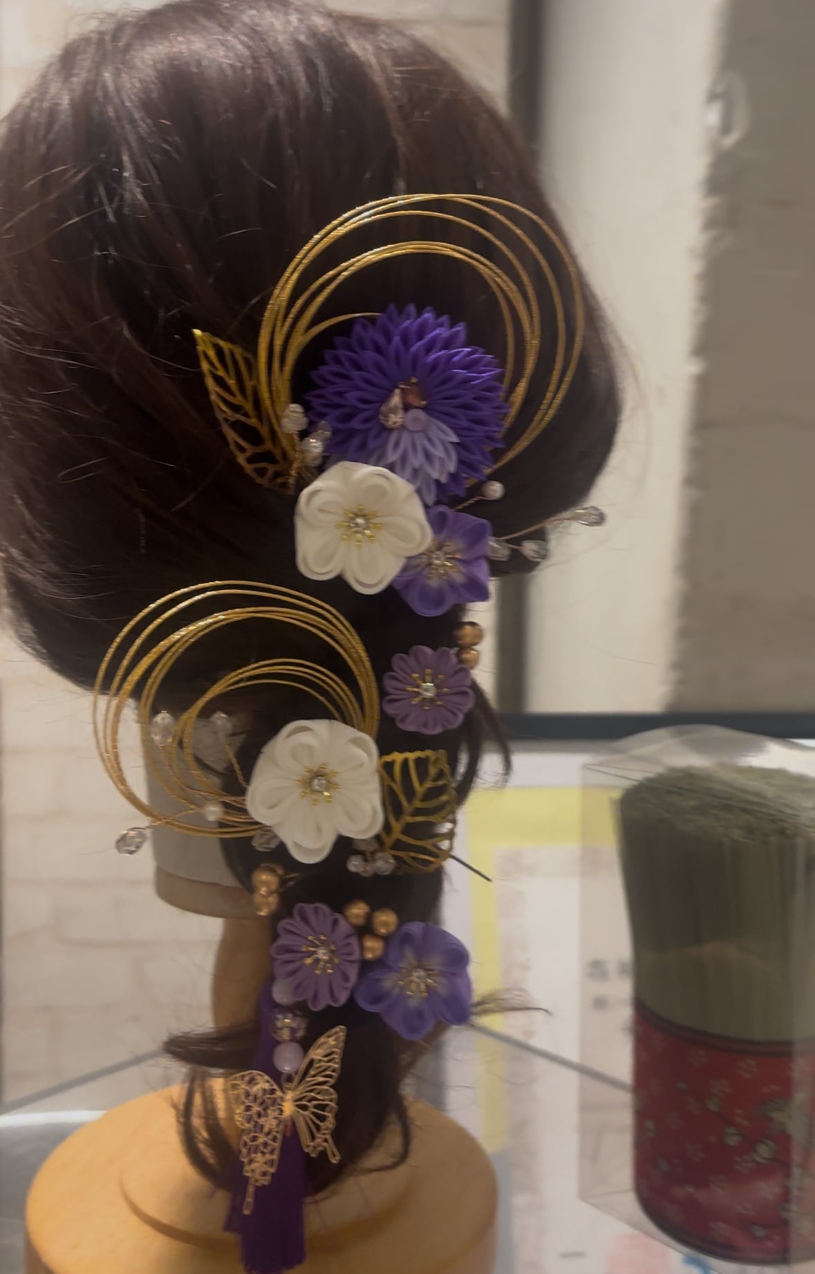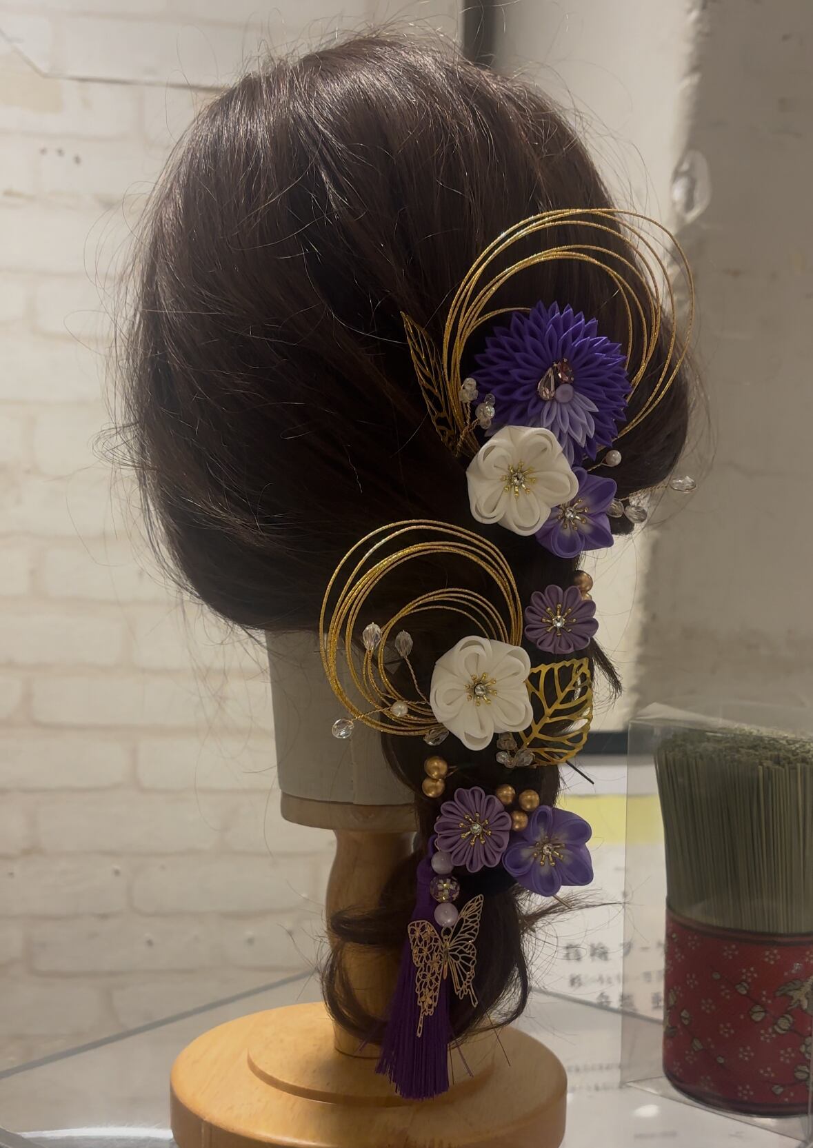 紫 ゴールド 正絹 手染め つまみ細工の髪飾り 水引